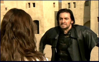 So, Guy loves Marian in his inimitable and dangerously dorky way (fatal attraction, perhaps?) and then, as she's trying to defend the King, she gets all spacey and in sudden rapture exclaims her triumphant and undying love for the weedy Robin. After leading Guy on for years. She stabs Guy in the heart with her words, and betrays Guy on such a massive scale in one fell swoop, when he has never betrayed her, that I can imagine he got a tad confused.